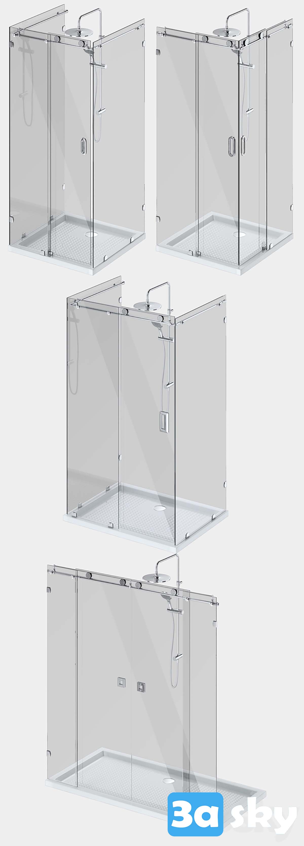 This 3D model showcases modern sliding glass shower cabins suitable for bathrooms and WC. The design is sleek and contemporary, perfect for interior design projects. Enhance your virtual space with this stylish addition.