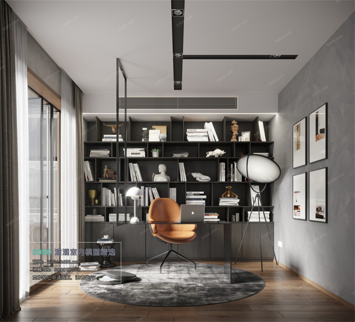 This 3D scene features a modern study space designed in a contemporary style. The Corona model showcases a sleek and functional interior, ideal for architectural visualization projects. The space is well-lit and furnished with modern furniture, creating a comfortable and stylish environment for studying or working. Explore this 3D model to inspire your own interior design projects.