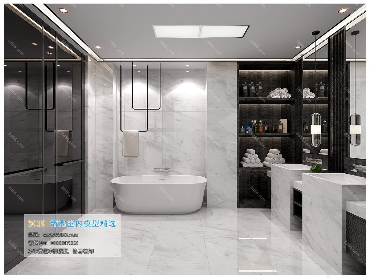 This 3D scene showcases a modern style bathroom space with a contemporary design. The layout features sleek lines, modern fixtures, and a clean aesthetic. Explore this preview to get a glimpse of the interior design details and layout of the space.