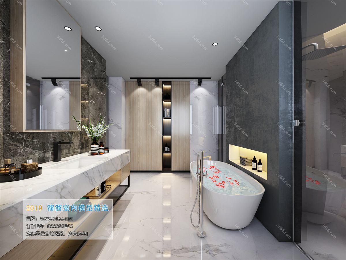 This 3D scene showcases a modern style bathroom space designed with elegance and functionality in mind. The interior design features contemporary elements and a clean aesthetic. Explore the layout, materials, and lighting of this 3D model to inspire your own design projects.
