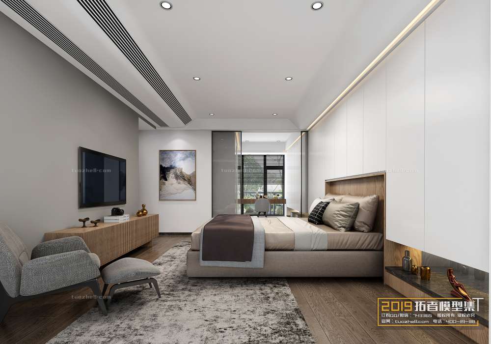 This 3D scene showcases a modern style bedroom with contemporary furniture and interior design elements. The room features a sleek and elegant design, perfect for those looking for inspiration in modern home decor. Created using 3DS MAX software, this scene offers a realistic representation of a stylish bedroom setting.
