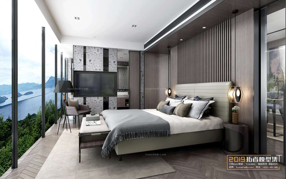 This 3D scene showcases a modern style bedroom with contemporary furniture and interior design elements. The room features a sleek and elegant design, perfect for those looking for a minimalist yet stylish living space. Explore the details of this 3D model created in 3DS MAX and get inspired for your own interior design projects.
