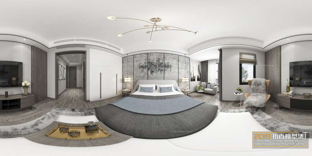 This 3D scene showcases a modern style bedroom with contemporary furniture and interior design elements. Experience the elegance and functionality of this well-designed space. Perfect for those looking for inspiration in modern home decor.