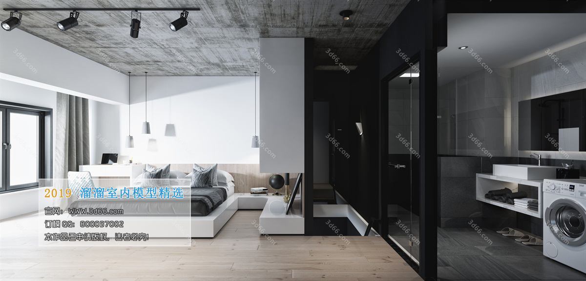 This 3D scene showcases a modern style bedroom space with elegant furniture and interior design elements. The room features a contemporary aesthetic with a focus on clean lines and minimalistic decor. Explore the design details and layout of this 3D model preview.
