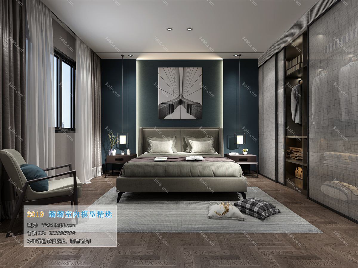 This 3D scene showcases a modern style bedroom space with contemporary interior design elements. The room features a sleek and stylish decor, creating a cozy and inviting atmosphere. Explore the details of this 3D model to inspire your own interior design projects.