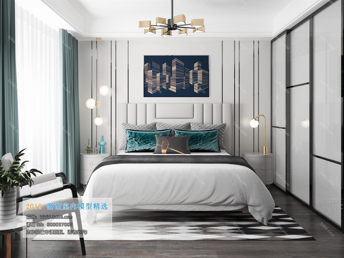 This 3D scene showcases a modern style bedroom space with contemporary furniture and decor. The design features a sleek and minimalist approach, creating a cozy and stylish ambiance. Explore the layout and details of this 3D model to get inspiration for your own interior design projects.