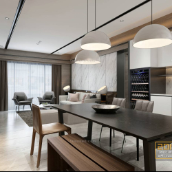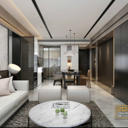 This 3D scene features a modern style living room with contemporary interior design elements. The room is elegantly decorated with a focus on modern aesthetics and functionality. Explore the layout and design details to gather inspiration for your own interior design projects.