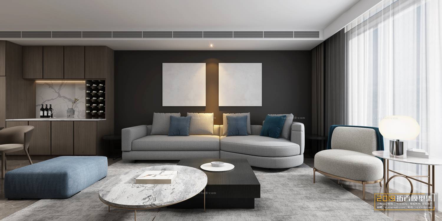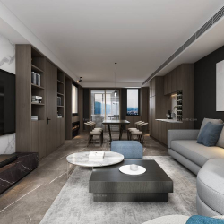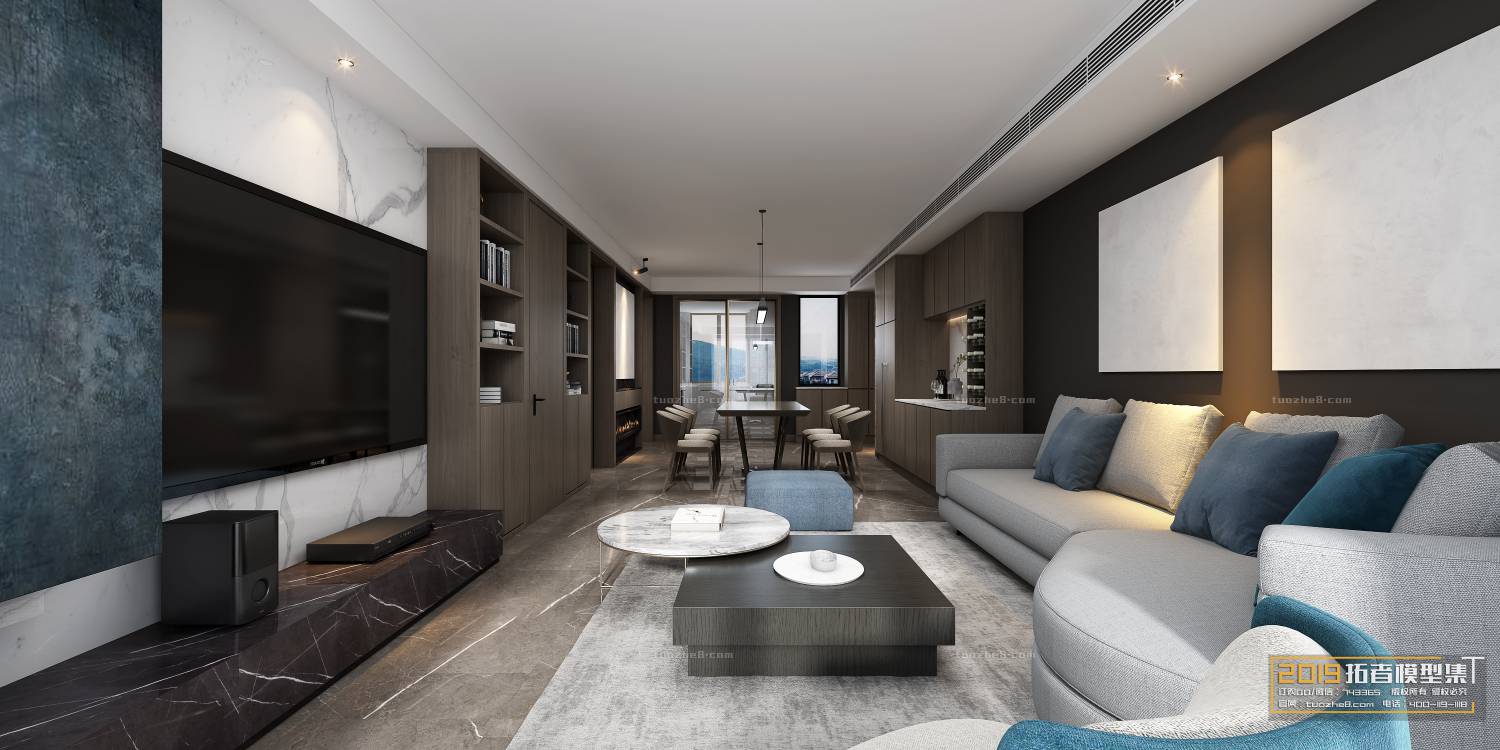 This 3D scene features a modern style living room with contemporary interior design elements. The room is elegantly decorated with a focus on clean lines and a sophisticated color palette. The layout is designed to maximize space and create a welcoming atmosphere. Explore this 3D scene for inspiration on modern living room design.