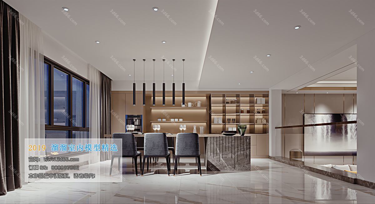 This 3D scene showcases a modern style restaurant kitchen with a contemporary design. The image provides a preview of the layout and aesthetics of the kitchen, highlighting its modern features and functionality. Explore the details of this 3D scene to get inspiration for your own design projects.