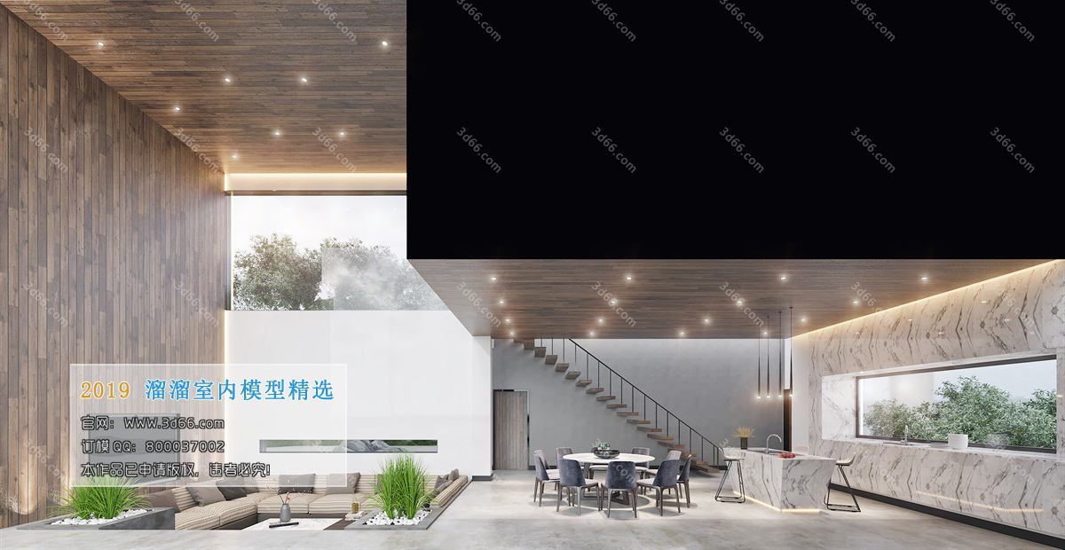 This 3D scene showcases a modern style restaurant kitchen with a contemporary design. The layout features sleek lines and functional spaces, perfect for a modern dining establishment. Explore the details and design elements in this visually appealing 3D rendering.