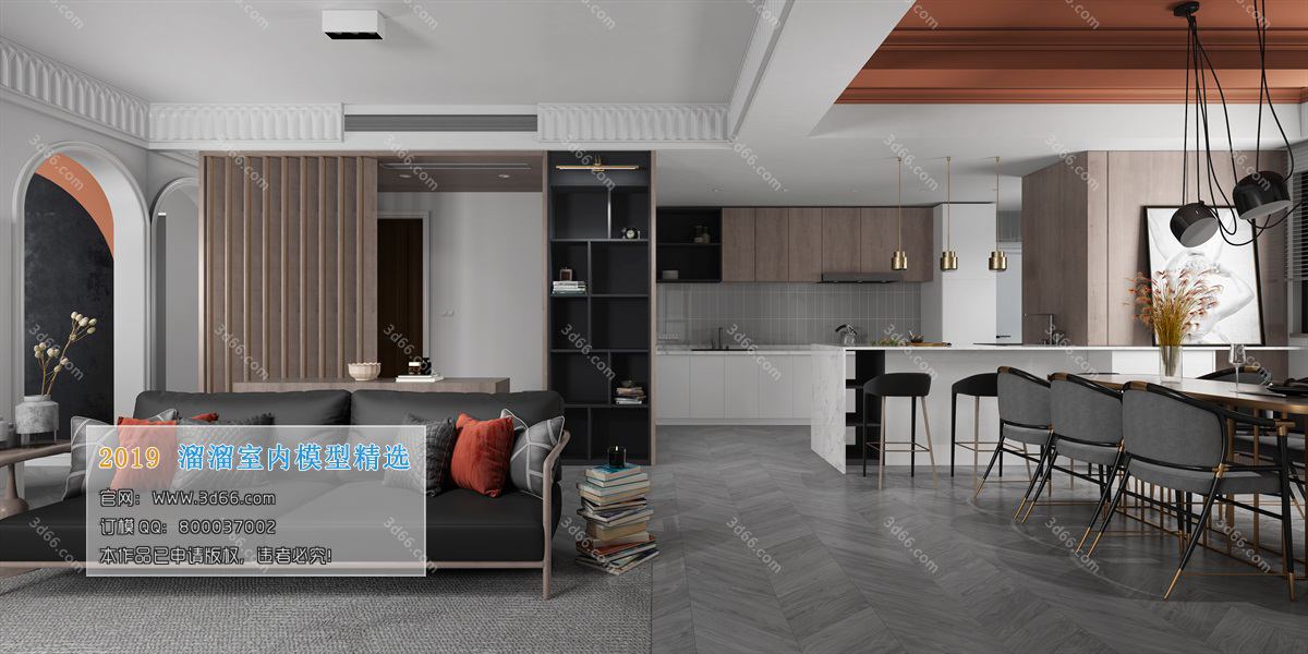 This 3D scene showcases a modern style restaurant kitchen designed in 3DS MAX. The image provides a preview of the contemporary layout and design elements, offering a glimpse into the aesthetic and functionality of the space.