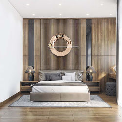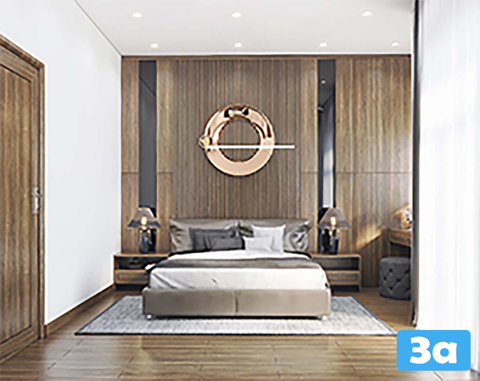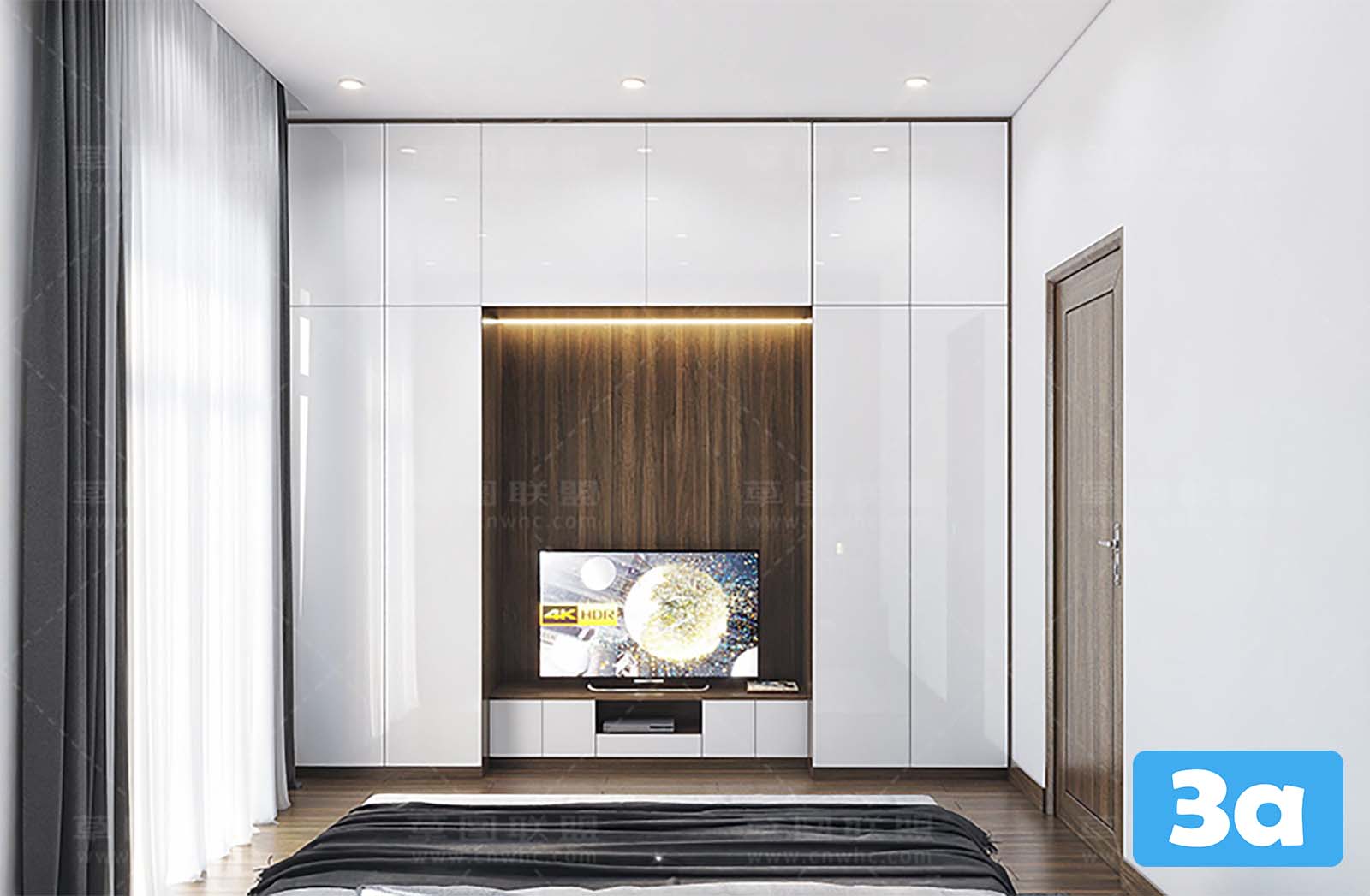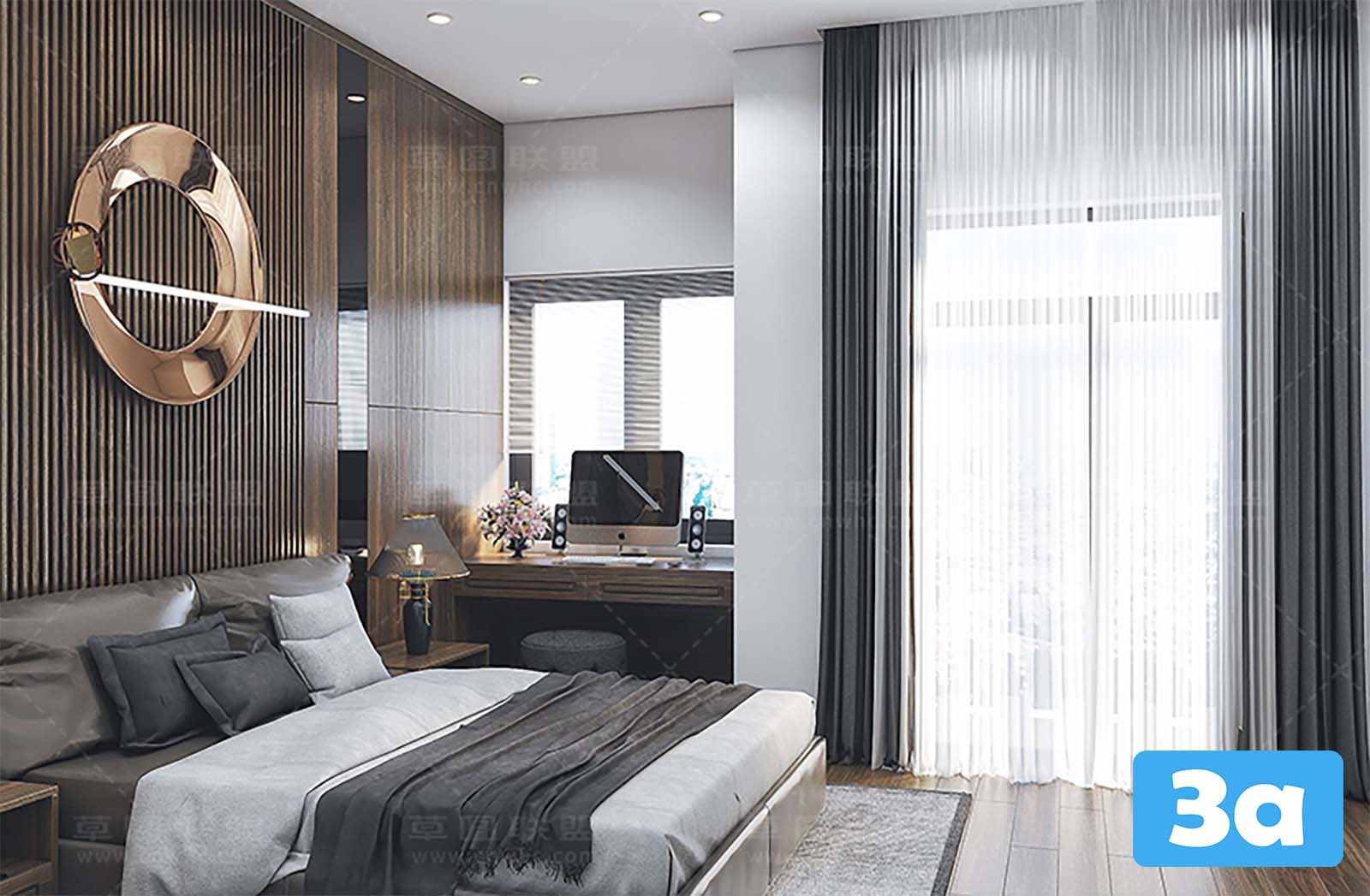 This 3D scene features a modern VR bedroom design with contemporary furniture and interior elements. Step into this virtual reality experience to explore the detailed design and layout of the bedroom.