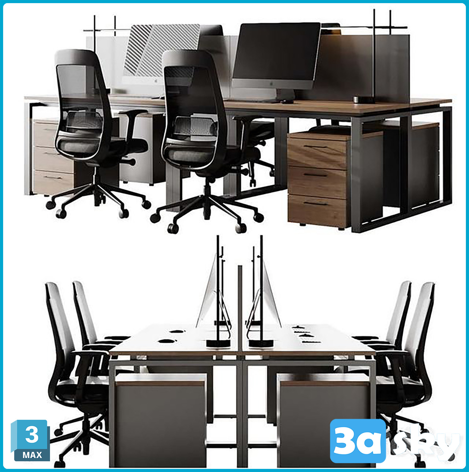 This 3DS MAX file features a collection of modern workplace furniture, including desks, chairs, and computers. Ideal for creating realistic office spaces in your 3D projects.