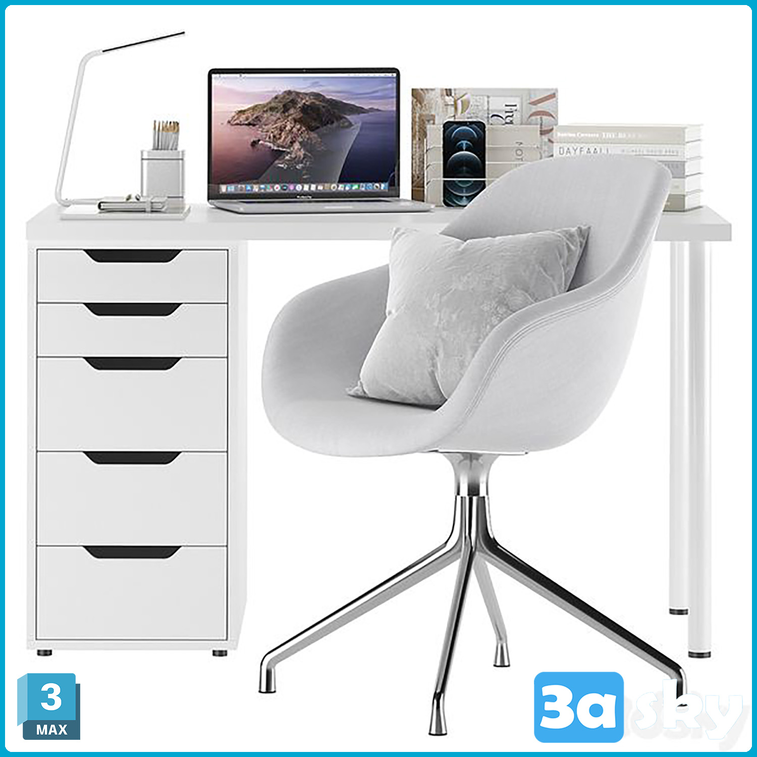 This 3D model preview showcases Office Furniture Set 002, a collection of modern and stylish office furniture including desks, chairs, and cabinets. The set is designed to enhance office spaces with its sleek and functional design. Perfect for interior designers and architects looking to elevate their office designs.