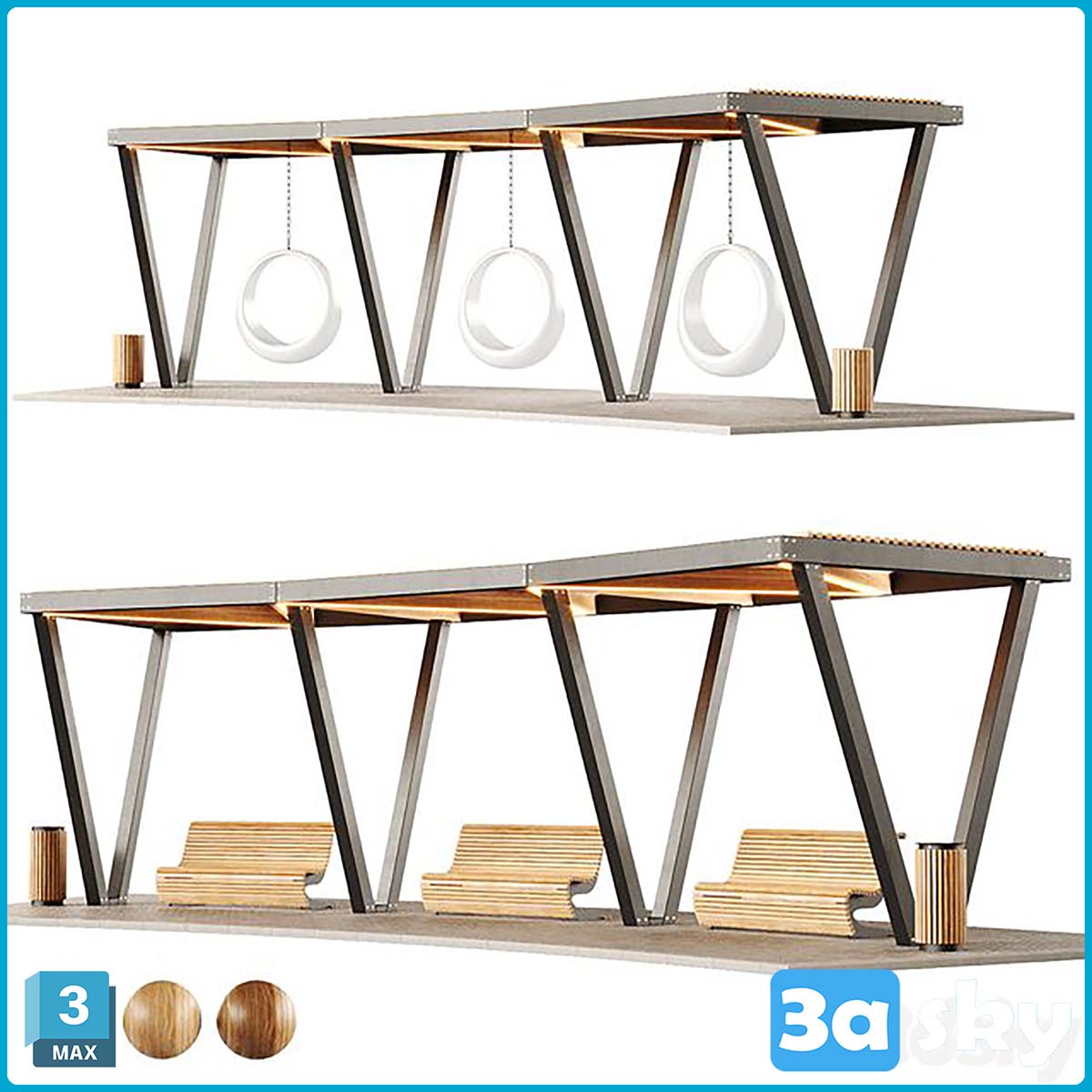 This 3D model showcases a pergola with swings and benches, ideal for outdoor architectural designs. Created using 3DS Max software, this detailed model is perfect for adding a touch of elegance to your architectural visualization projects.