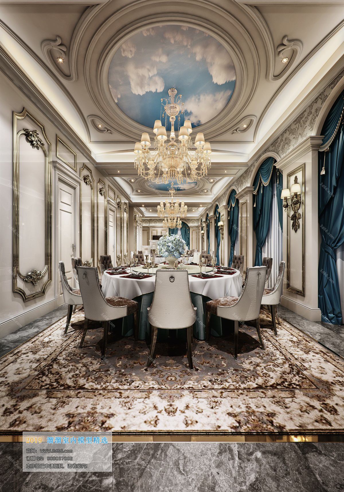 This 3D scene showcases a private room designed in European style, featuring exquisite furniture and decor elements. The room exudes elegance and sophistication, with attention to detail in every corner. Explore the intricate design and layout of this European-inspired space.