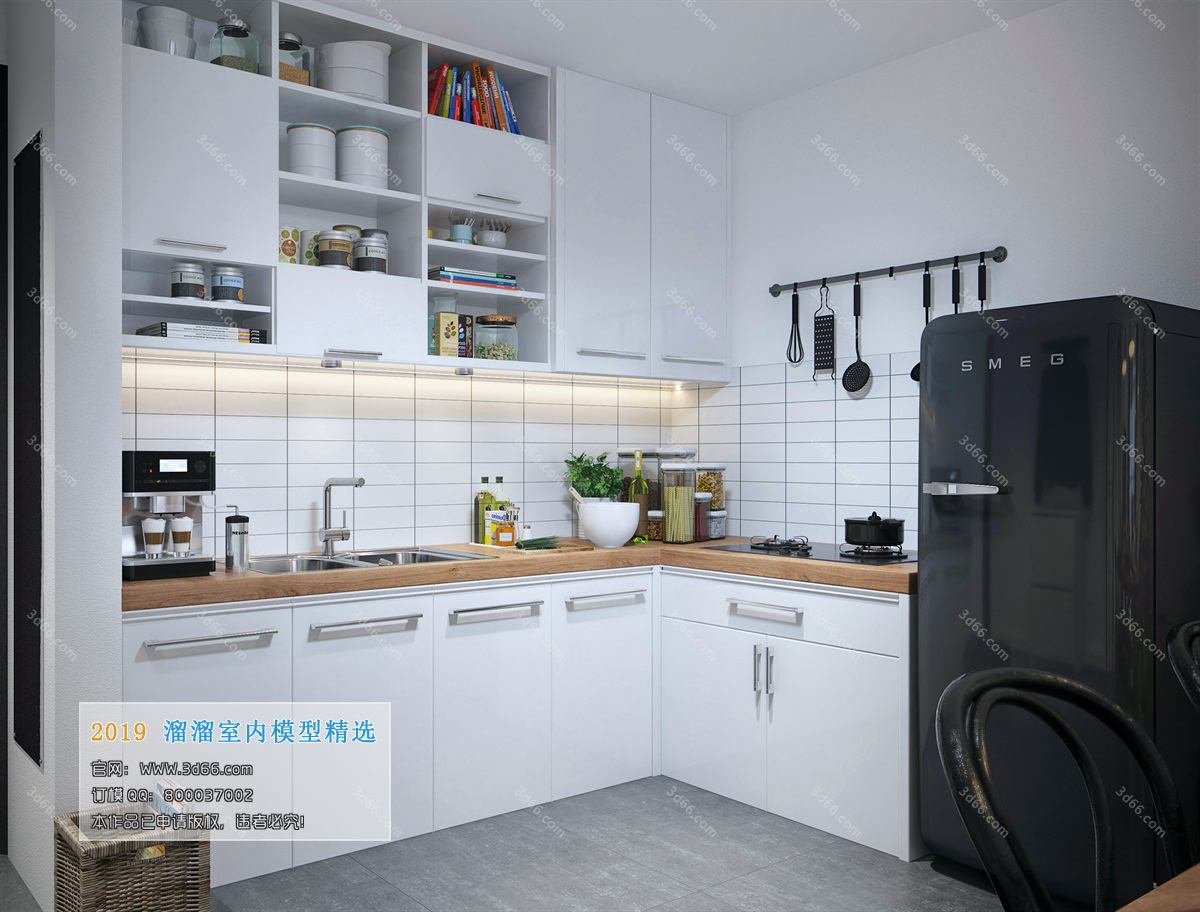 This 3D scene preview showcases a restaurant kitchen designed in Nordic style. The modern design elements and functional layout create a visually appealing and practical space. Explore the intricate details of the kitchen setup and imagine the possibilities for your own design projects.
