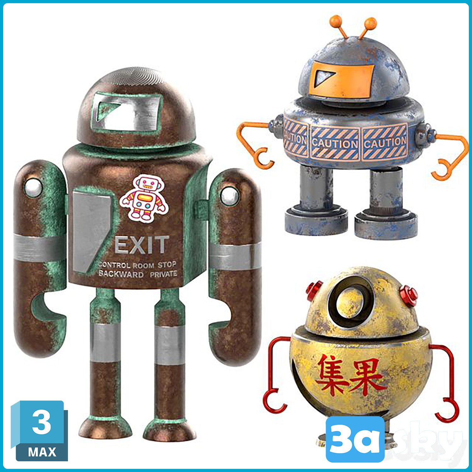 This image features a preview of the Robot Collection Vol. 05 in 3DS MAX/KIDS. It includes a variety of robot models designed for creative projects and animations.