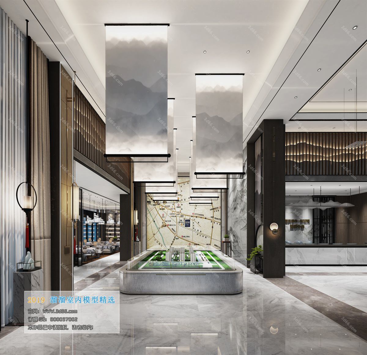 This 3D scene features a Sales Center designed in a Chinese style, blending traditional elements with modern architecture. The interior design showcases intricate details and a fusion of cultural influences. Explore the harmonious blend of traditional Chinese aesthetics with contemporary design concepts in this visually captivating scene.