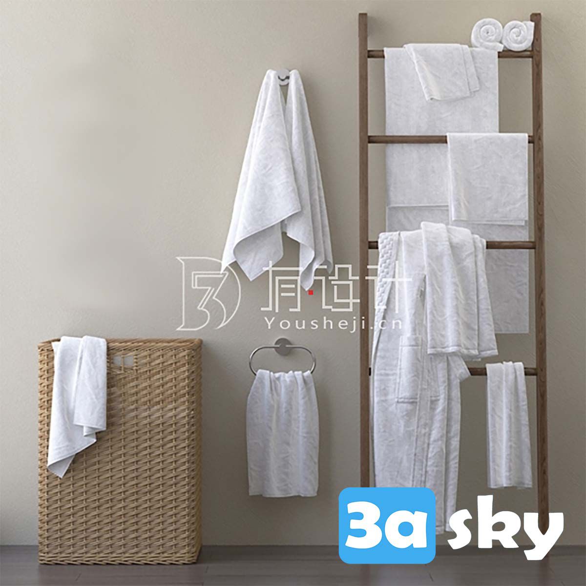 This 3D model showcases a set of towels designed for the bathroom. It is created in 3DS MAX and is ideal for bathroom and WC interior design projects. The set includes various types of towels suitable for different bathroom styles and themes.