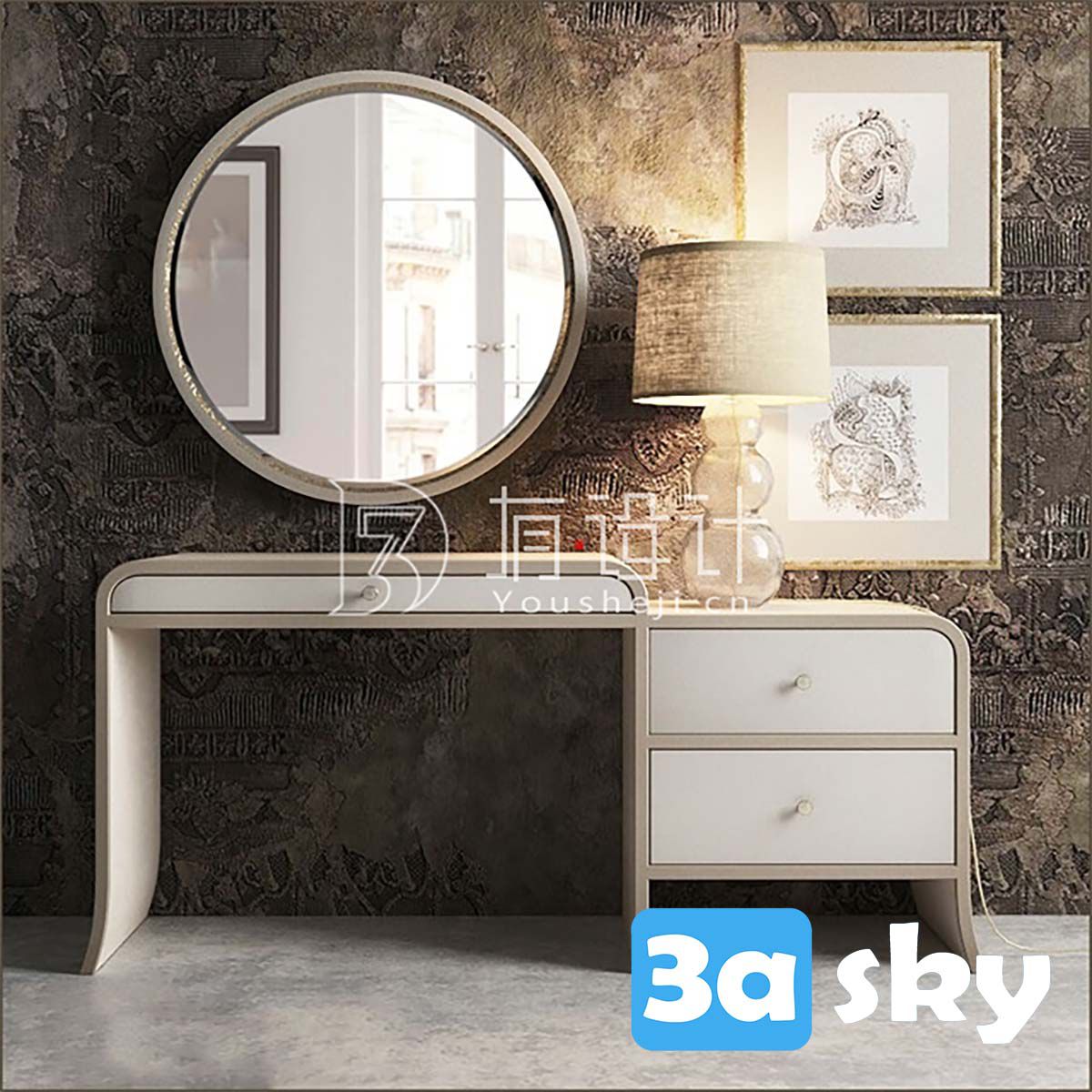 This 3D model features a sideboard with a stylish table lamp and a mirror, perfect for adding a touch of elegance to your interior design projects. The intricate details and realistic textures make this model a great addition to any 3D rendering or visualization project.