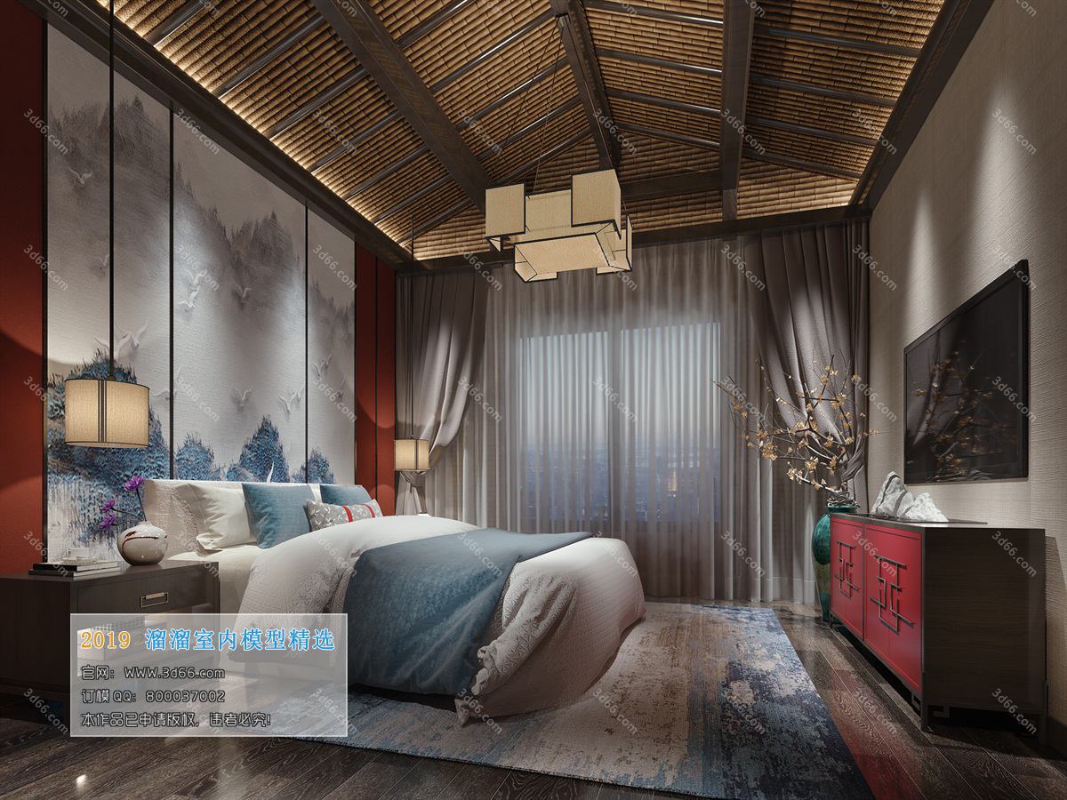 This 3D scene showcases a bedroom space designed in Southeast Asian style. The room features elements typical of Southeast Asian decor, including intricate patterns, wooden furniture, and warm color tones. Perfect for those seeking inspiration for interior design projects or looking to visualize a cozy and inviting bedroom space.