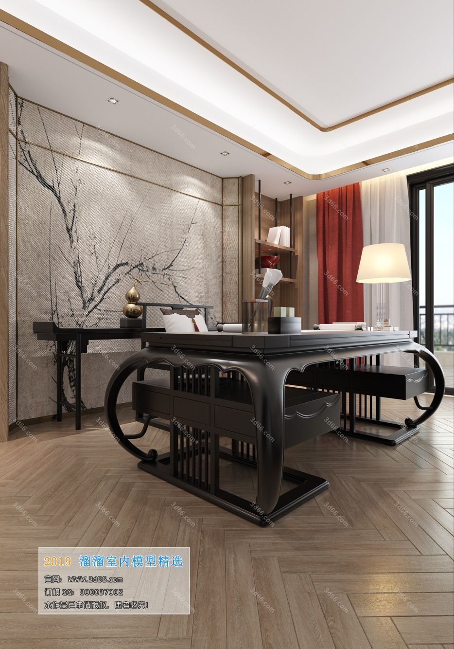 This 3D scene showcases a study space designed in Chinese style, featuring a blend of traditional elements and modern design aesthetics. The room is elegantly furnished with traditional Chinese furniture and decor, creating a harmonious and serene atmosphere. Perfect for those looking to create a unique and culturally inspired study room in their own space.