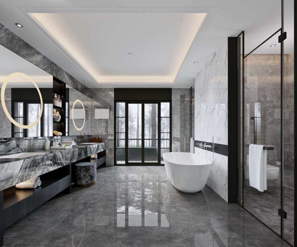 This 3D scene showcases a modern toilet bathroom design with a focus on interior layout and design elements. Explore the intricate details and innovative features of this contemporary bathroom setting. The scene provides a realistic representation of a stylish and functional bathroom space, perfect for architectural visualization and interior design inspiration.