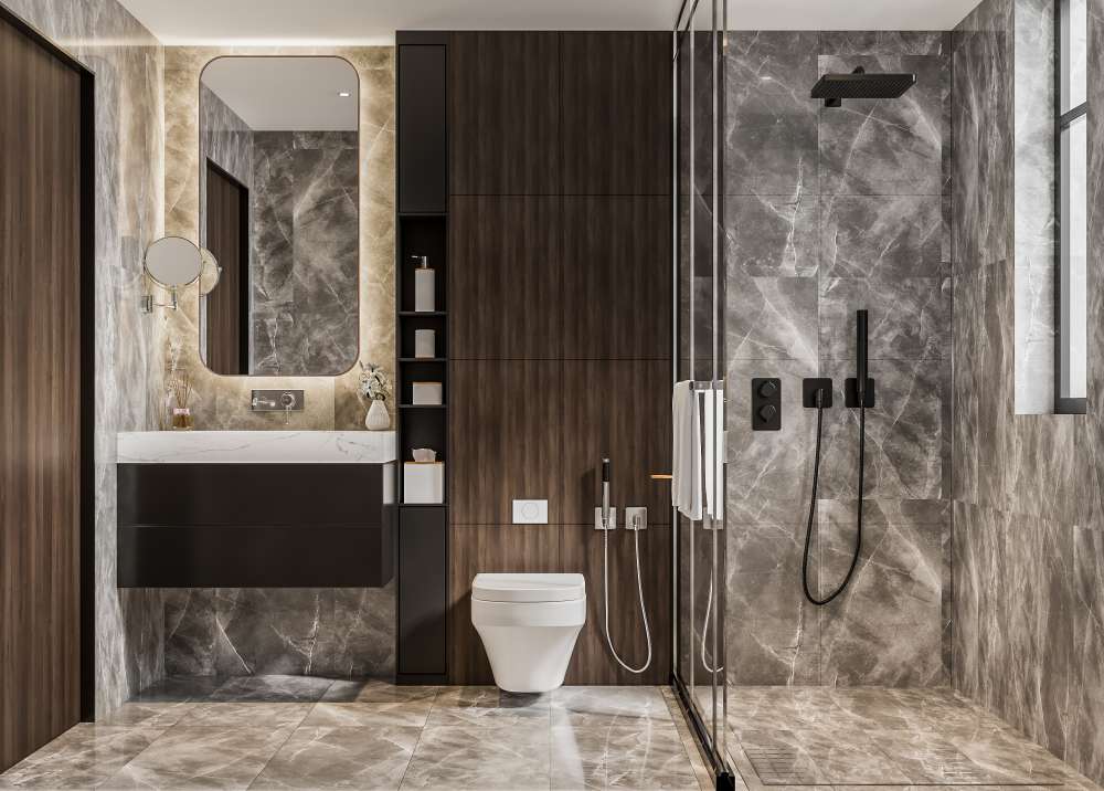This 3D scene showcases a modern toilet bathroom design created in 3DS MAX. The scene includes detailed elements such as fixtures, tiles, and lighting, providing a realistic representation of a contemporary bathroom space.
