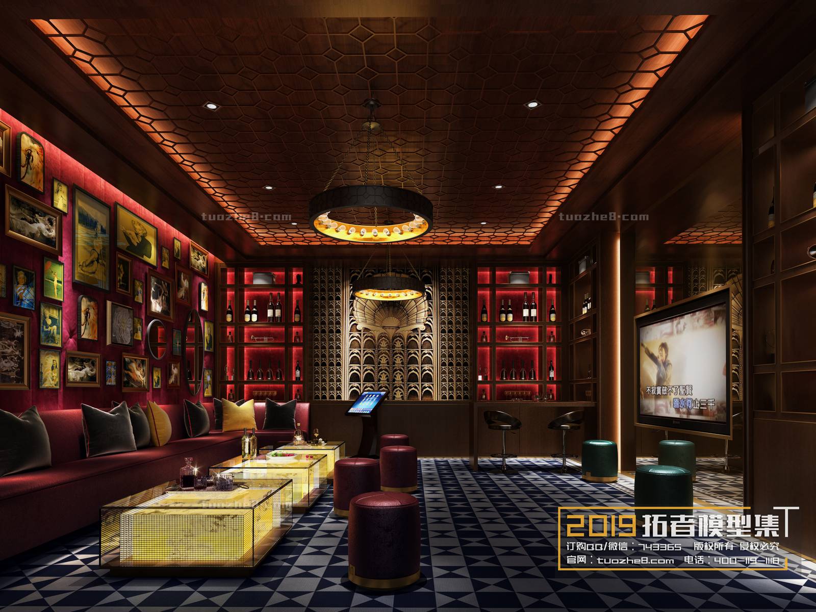 This 3D scene showcases the interior design of a KTV bar, featuring modern furniture and lighting. The high-quality 3D model is suitable for architectural visualization and interior design projects.