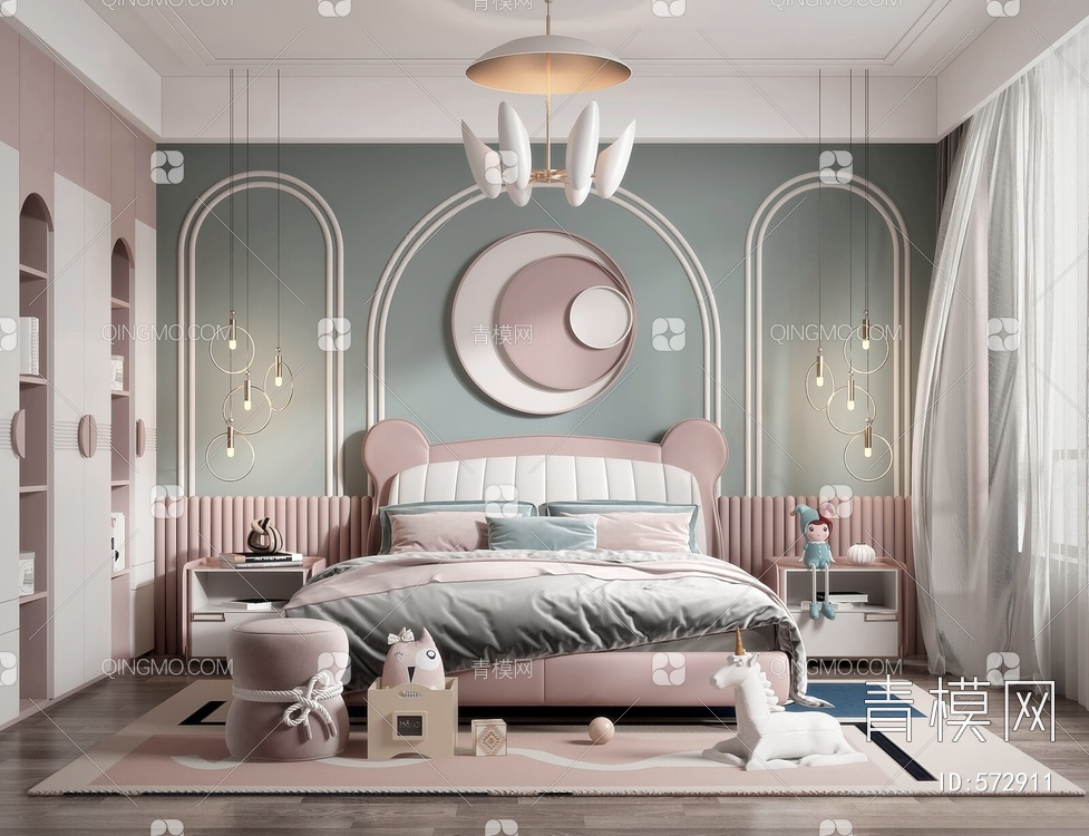 This 3D scene features a kid's bedroom with a cozy bed and playful decor elements. The design is perfect for showcasing children's furniture or interior design concepts. Download the 3DS MAX file to explore the details and use it in your projects.