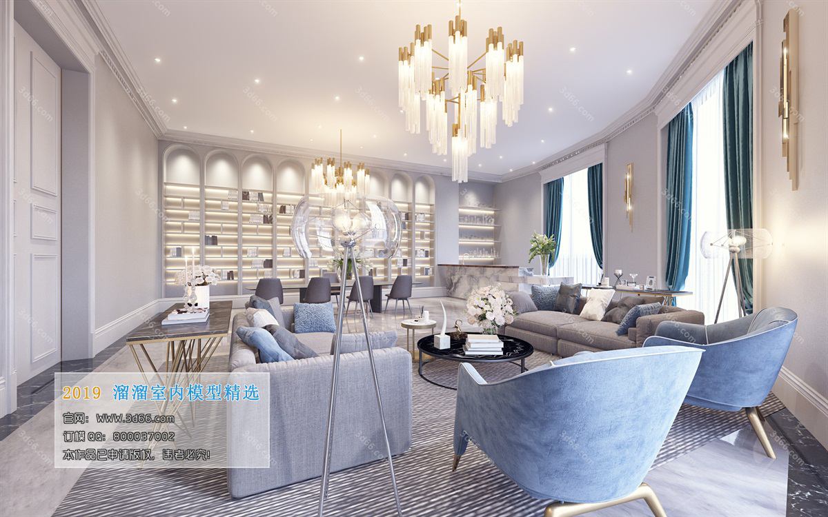 This 3D scene features the interior design of the V Club House in a postmodern style. The space is designed with a modern and luxurious aesthetic, incorporating elements of postmodern architecture. The scene provides a glimpse into the sophisticated and stylish ambiance of the club house, perfect for showcasing contemporary design concepts.