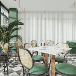 This image showcases the V Hotel Teahouse Cafe in a modern style with a Corona model. The design features contemporary elements and a stylish ambiance. Perfect for those looking for inspiration in modern interior design.