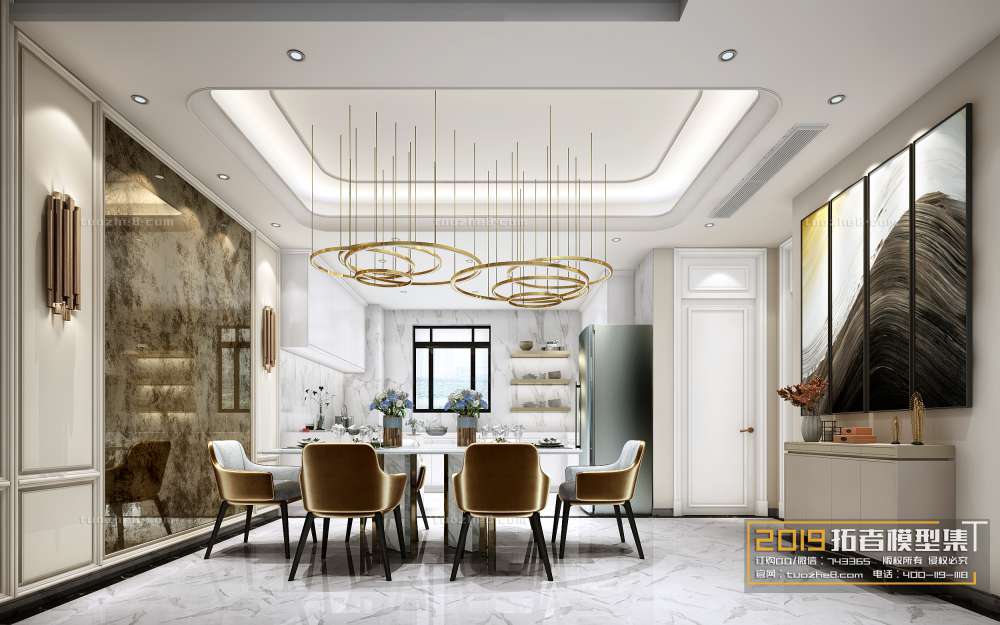 This 3D scene features a modern kitchen with stylish furniture and appliances. Perfect for interior design projects, this high-quality 3D model provides a realistic representation of a contemporary kitchen space.