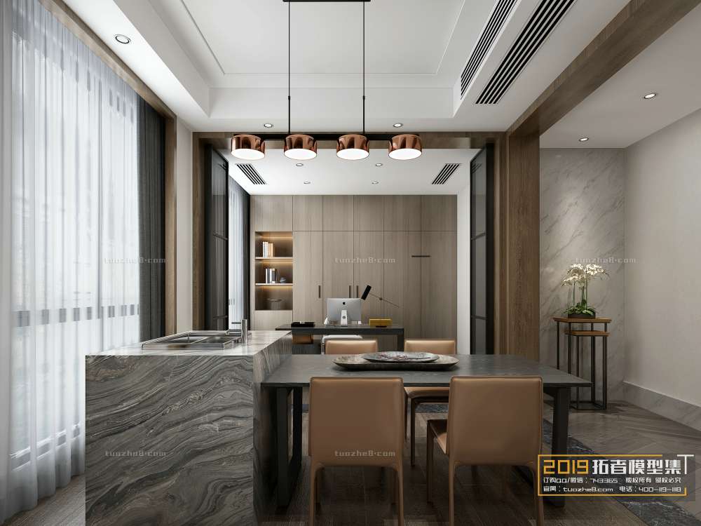 This 3D scene showcases a modern kitchen design with stylish furniture and appliances. Perfect for interior design projects and visualizations.