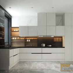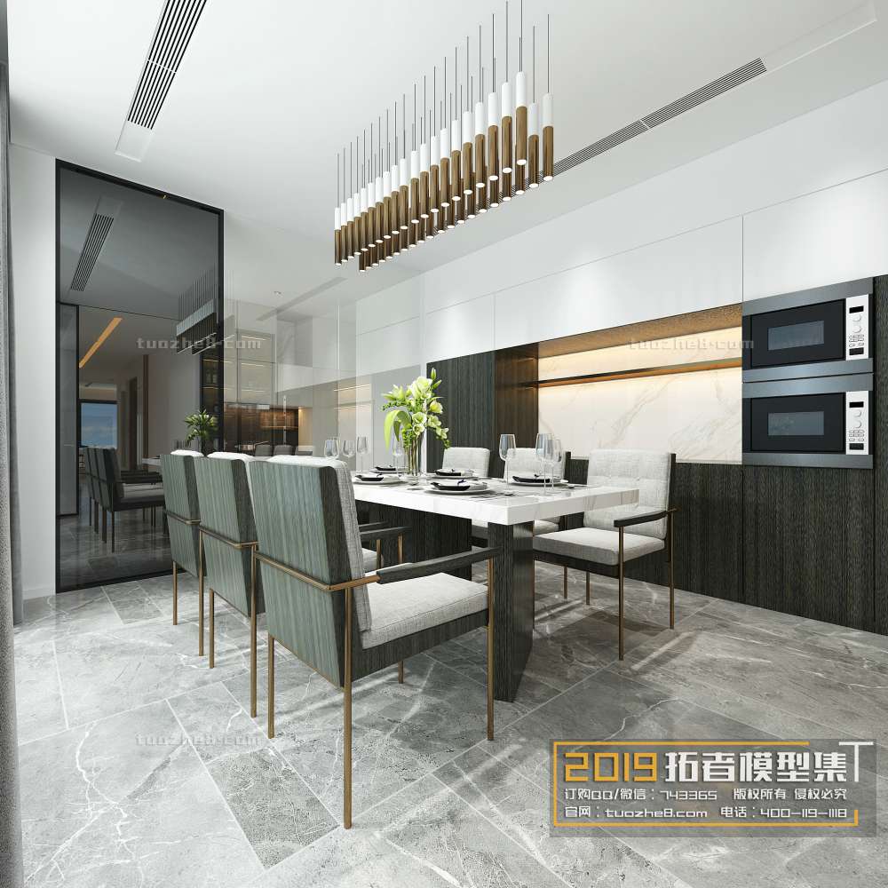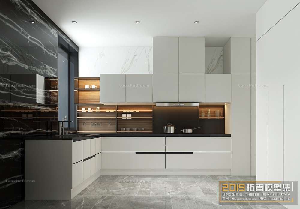 This 3D scene showcases a modern kitchen design with stylish furniture and appliances. Perfect for interior design projects and visualizations.