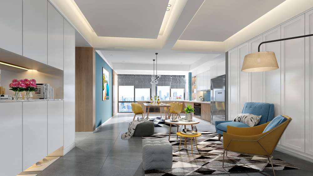 This 3D scene showcases a modern kitchen design with stylish furniture. It is perfect for interior design projects and visualization. Explore this high-quality 3D model in our library.