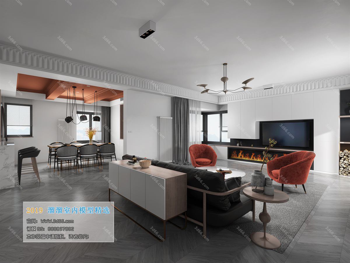 This 3D scene showcases a modern living room space with contemporary furniture and decor. The design features a sleek and stylish layout, perfect for inspiration and visualization in interior design projects.