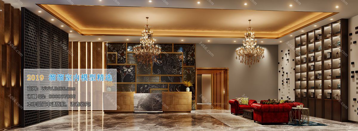 This 3D scene showcases the front desk area in an American style lobby. The design features a blend of modern and traditional elements, creating a welcoming and stylish ambiance. The attention to detail in the furniture and decor highlights the elegance of the space. Experience the essence of American design with this captivating 3D model.