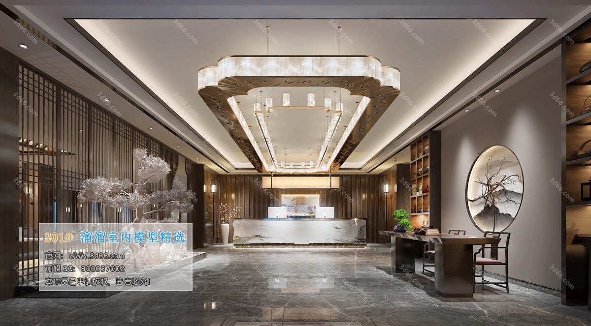 This 3D scene features a modern lobby setting with a Chinese-inspired front desk design. The intricate details and elegant style of the front desk make it a standout feature in any interior design project. Explore this 3D model to get inspiration for your own design projects.