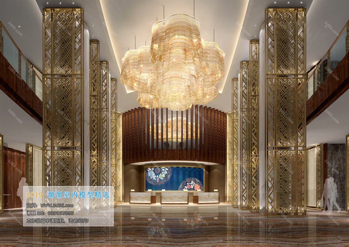 This 3D scene showcases a postmodern style front desk in the V Lobby. The design features intricate details and modern elements, creating a visually appealing and functional space. Explore the unique blend of contemporary and postmodern design in this captivating 3D model.