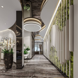 This 3D scene features a modern lobby space with sleek design elements. The interior is beautifully crafted with attention to detail, creating a welcoming and stylish environment. Perfect for showcasing modern interior design concepts.