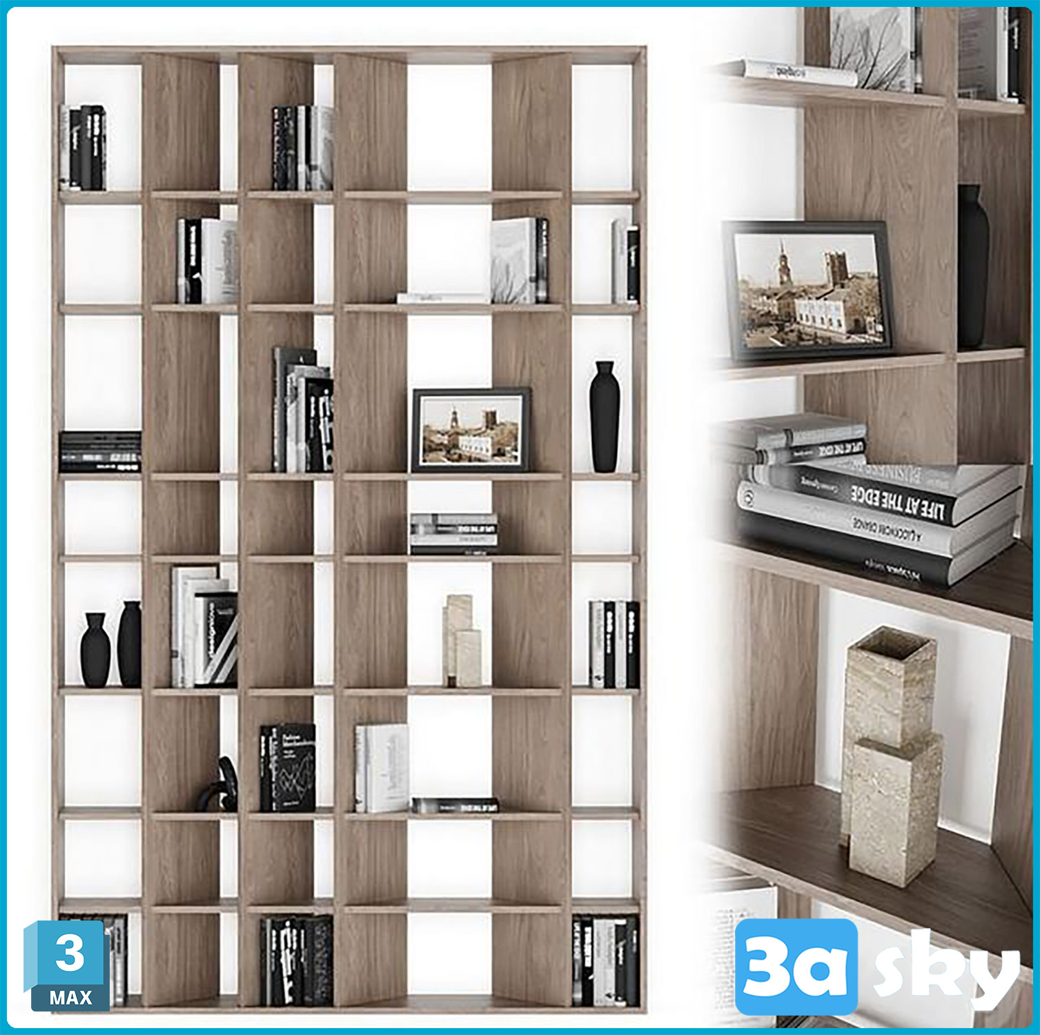 This 3D model showcases a V-Rack with wooden books, a decorative vase, and other decor items. It is perfect for adding a touch of elegance to your interior design projects. The realistic details and textures make it a great addition to any 3D library collection.