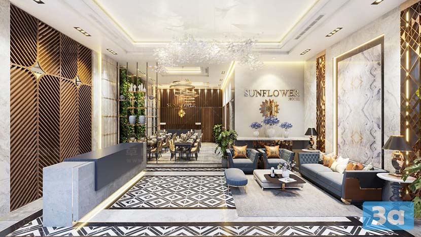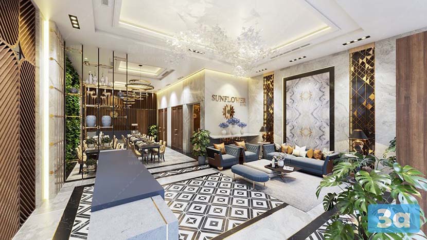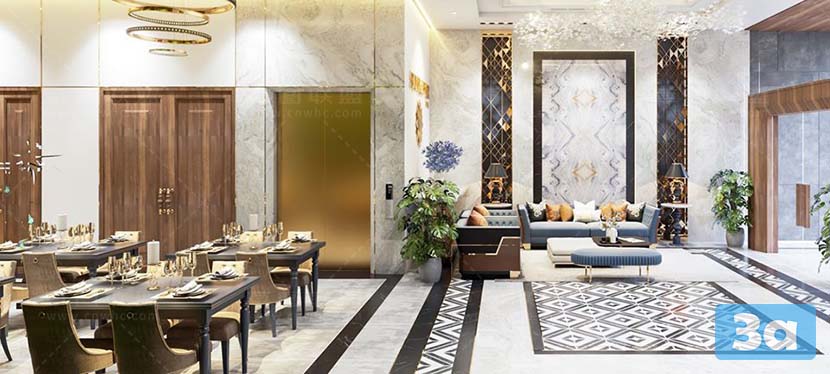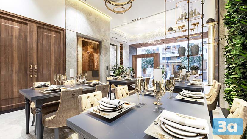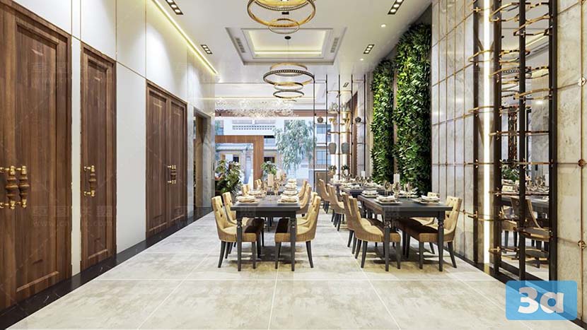 This 3D scene showcases a stunning dining room interior rendered using V-Ray. The attention to detail in the design and lighting creates a realistic and inviting space. Perfect for interior designers, architects, and anyone looking for inspiration in creating elegant dining room settings.