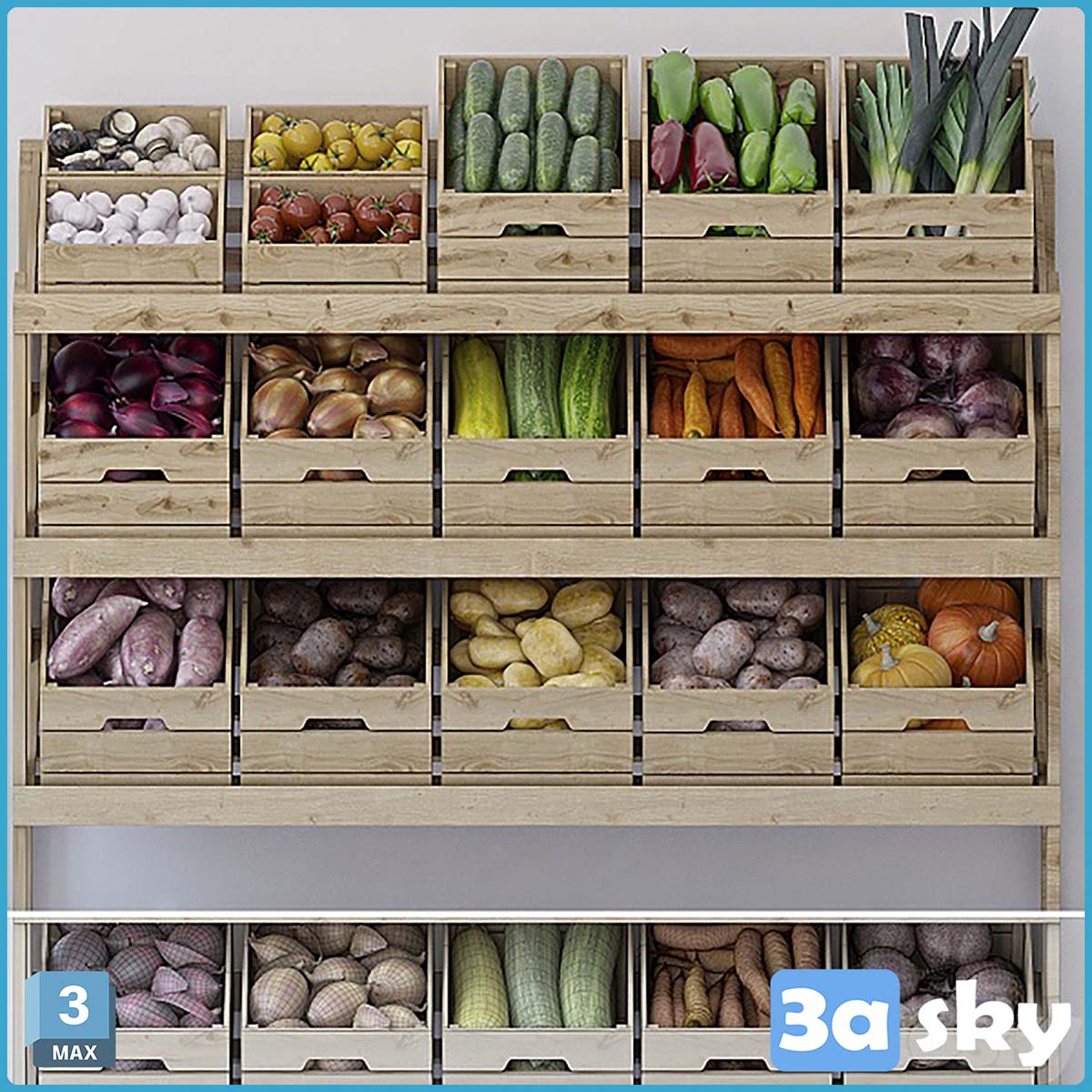 This 3D model features a V stand with a variety of fresh vegetables beautifully displayed. It is a high-quality model suitable for kitchen, interior design, and decoration projects. Download this 3D model to enhance your design visuals.