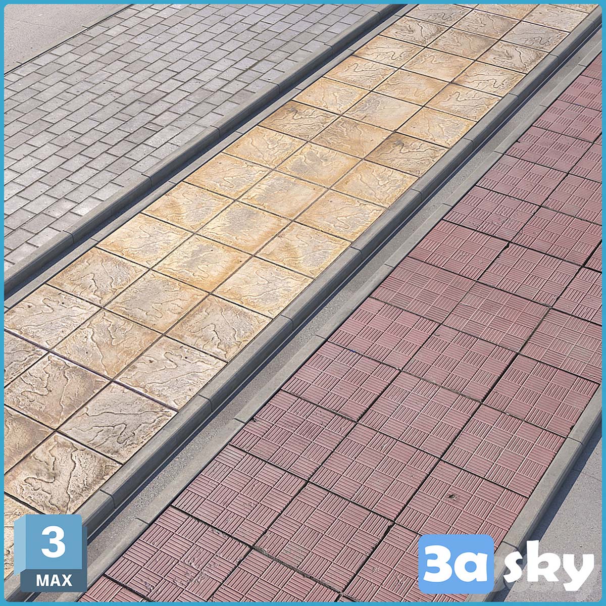 This 3D model showcases three variants of pavement with road, perfect for adding realistic details to your architectural projects. The high quality design and intricate details make it a great choice for enhancing your visualizations. Download now and elevate your design with these stunning decoration options.