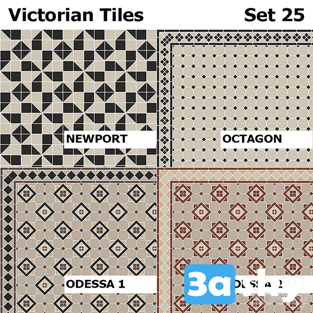This 3D model features a set of Victorian tiles designed for interior decoration. The intricate patterns and high-quality design make it perfect for adding a touch of elegance to your projects. Explore the beauty of Victorian style with this detailed and versatile set of tiles.