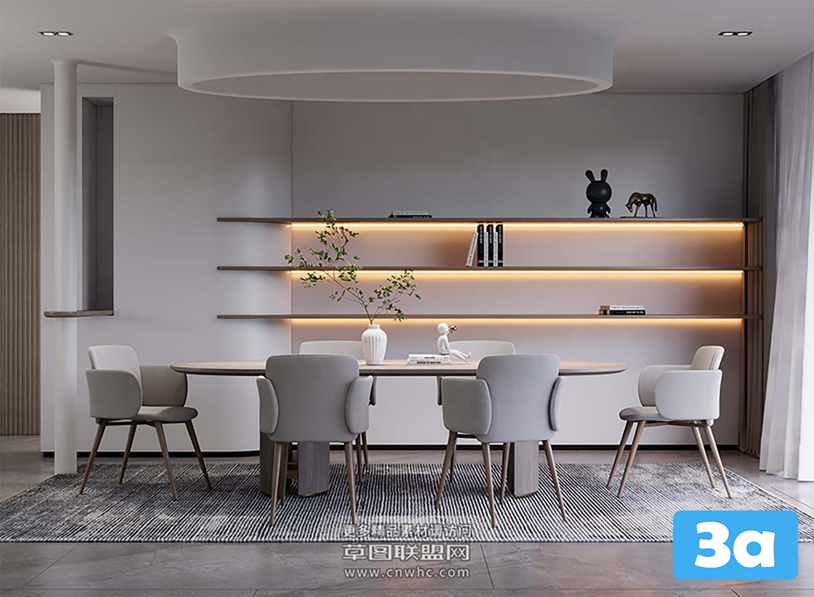 This 3D scene features a virtual reality dining room setup with modern furniture and interior design elements. The VR technology allows for an immersive experience, showcasing the detailed design of the dining room. Explore this 3D model to get inspiration for your own interior design projects.