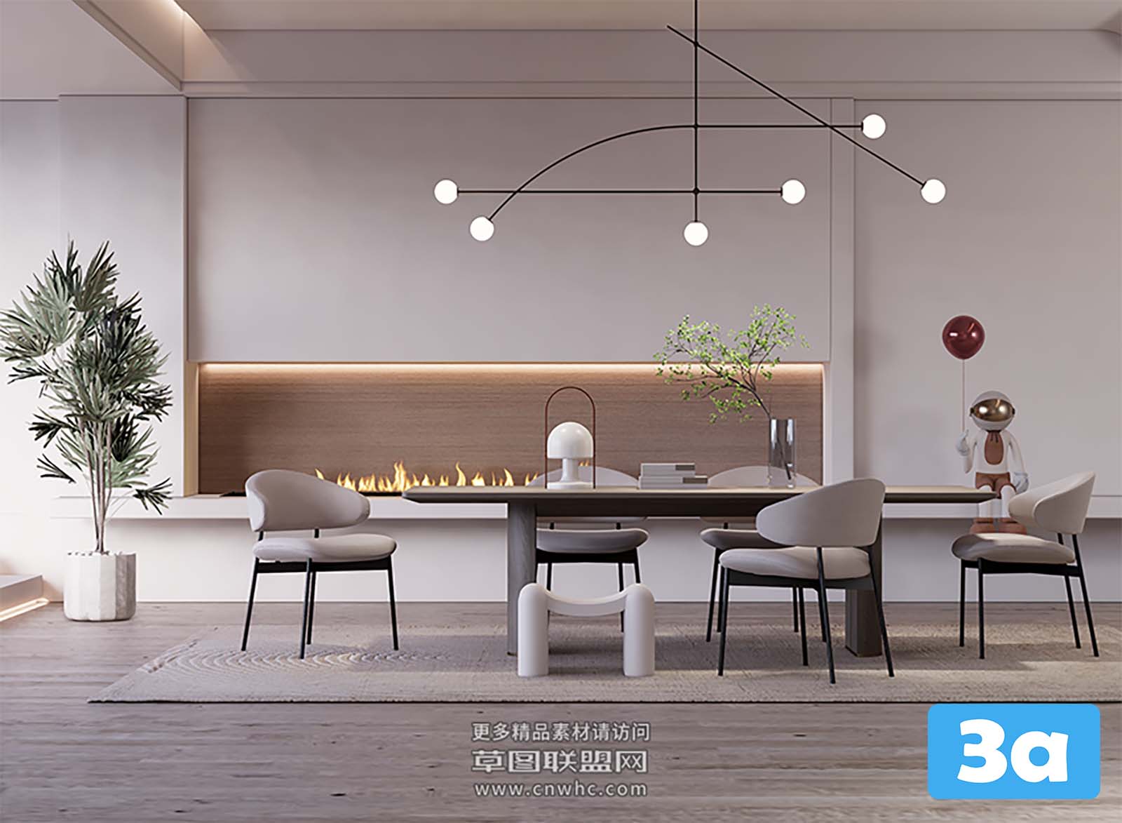 This 3D scene showcases a virtual reality dining room, ideal for architectural visualization and interior design projects. The scene features detailed furniture and lighting, creating a realistic and immersive experience. Perfect for exploring different design concepts and layouts. Created using Sketchup software.