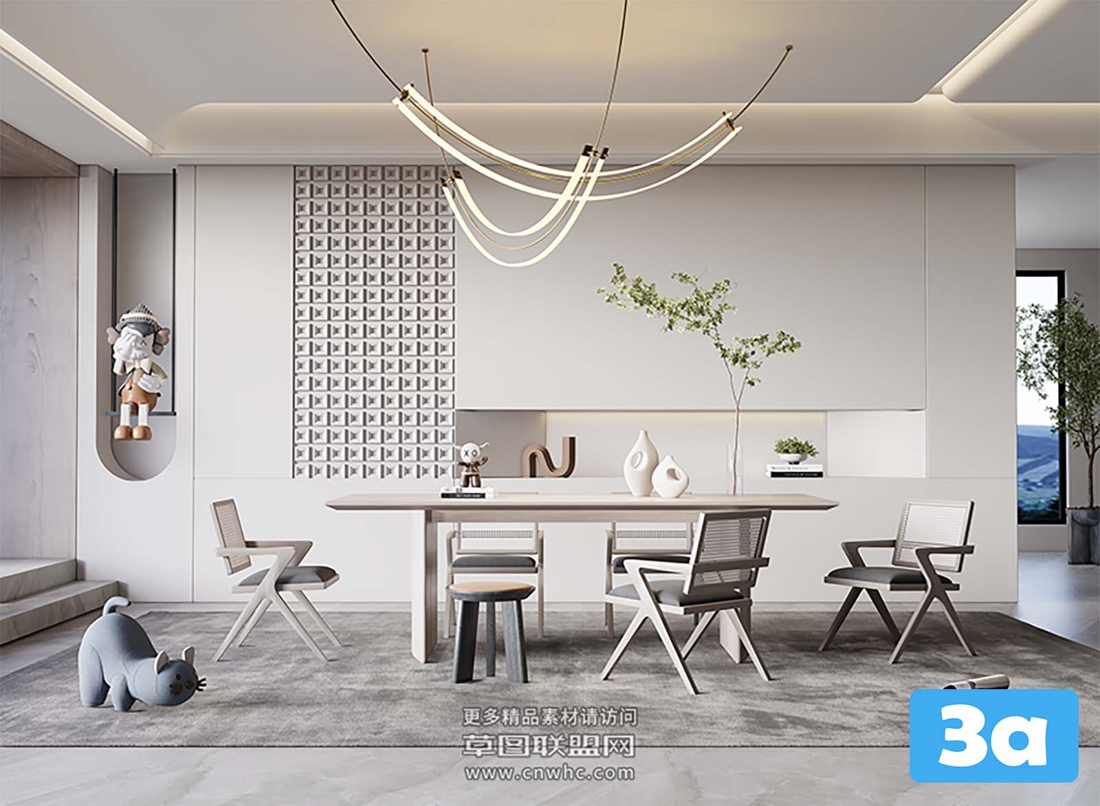 This 3D scene showcases a virtual reality dining room with a modern design. The room features contemporary furniture and a stylish layout, providing a realistic and immersive experience for viewers. Explore the details of this virtual dining room and get inspired for your own interior design projects.